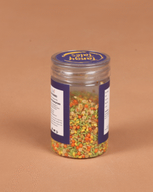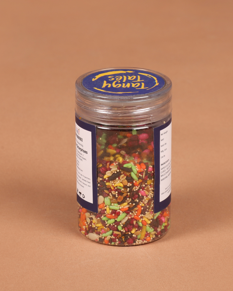 Tangy Tales Bombaiya Mukhwas is a vibrant and flavorful after-meal mouth freshener made with roasted fennel, sesame, and colorful sugar-coated ingredients for freshness and taste.