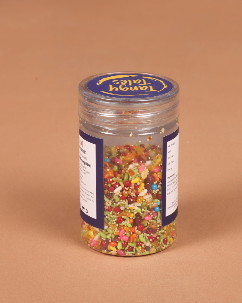 Indulge in the royal taste of Tangy Tales Shahi Mewa Mix – a rich blend of dry fruits, seeds, and colorful mukhwas for a refreshing after-meal experience.
